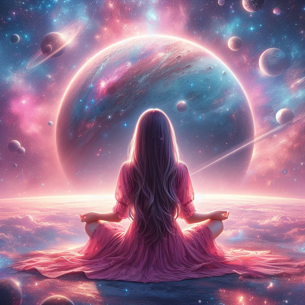 A woman sits in a meditative pose, facing a large, colorful planet in a starry sky.