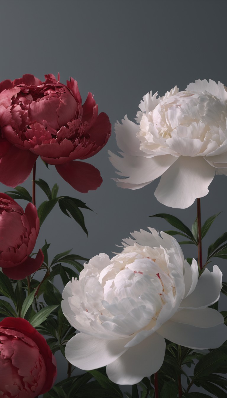 Close-up of four peonies, two white and two red, against a gray background.