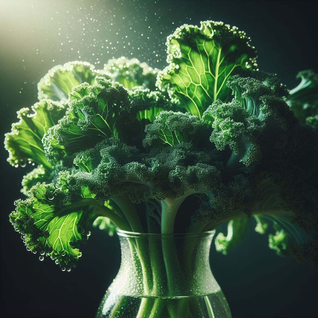 A bunch of fresh kale sits in a glass vase on a dark background, illuminated by soft sunlight.
