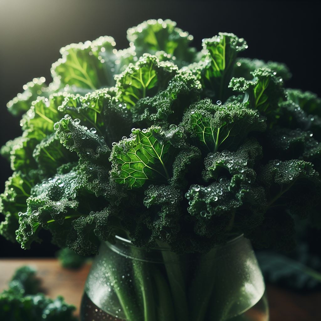 A close-up of a bunch of fresh kale leaves in a glass vase. The leaves are green and glistening with water droplets.