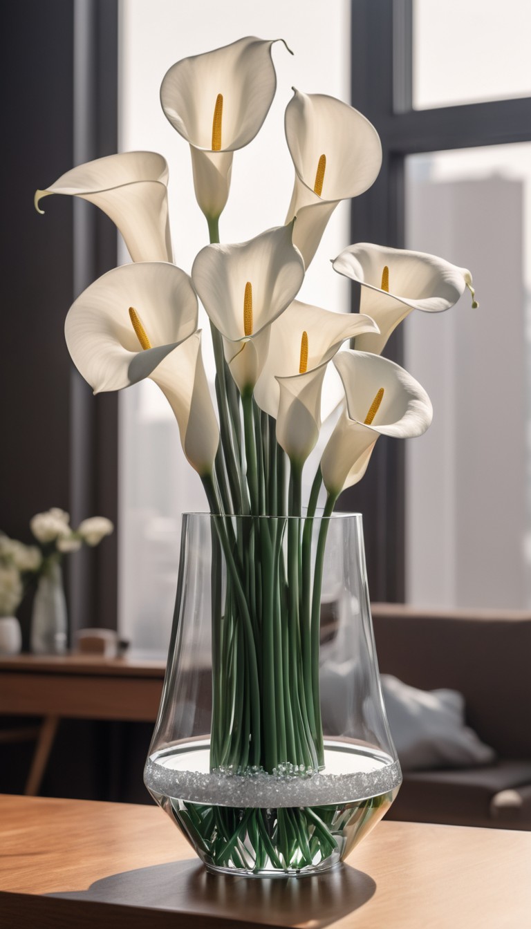 A bouquet of white calla lilies sits in a clear glass vase on a wooden table.