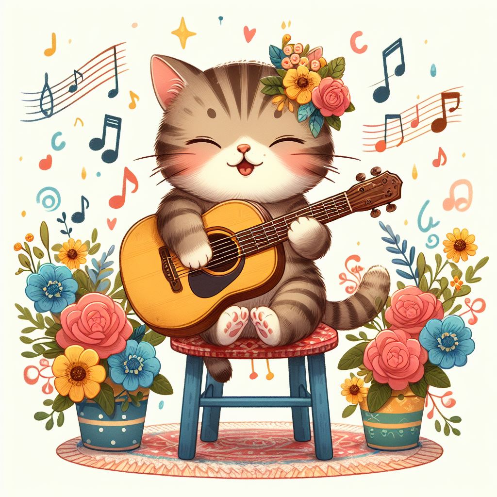 acoustic, adorable, animal, art, cartoon, cat, colorful, cute, floral, flowers, guitar, happy, illustration, instrument, music, musical, play, sitting, smile, stool