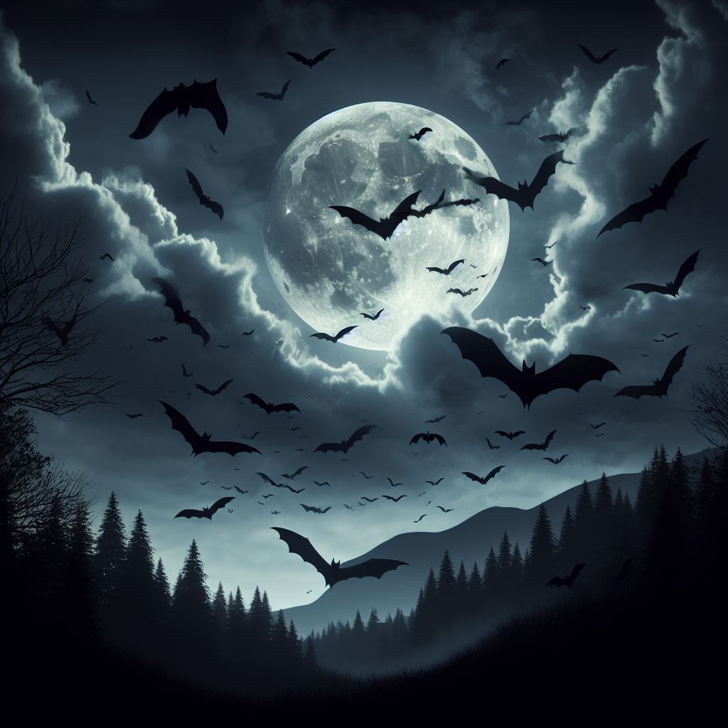 bats, clouds, creatures, dark, flying, forest, full, halloween, magical, moon, mystical, nature, night, nocturnal, silhouette, sky, spooky, trees, wildlife, woodland