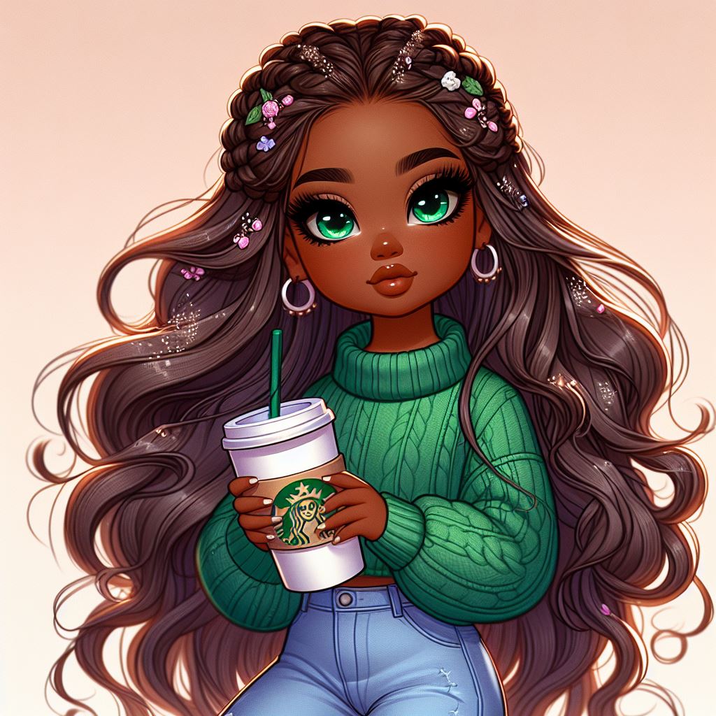 braids, brown, cartoon, coffee, cup, cute, drink, fashion, female, girl, green, hair, holding, illustration, long, pretty, style, sweater, woman, young