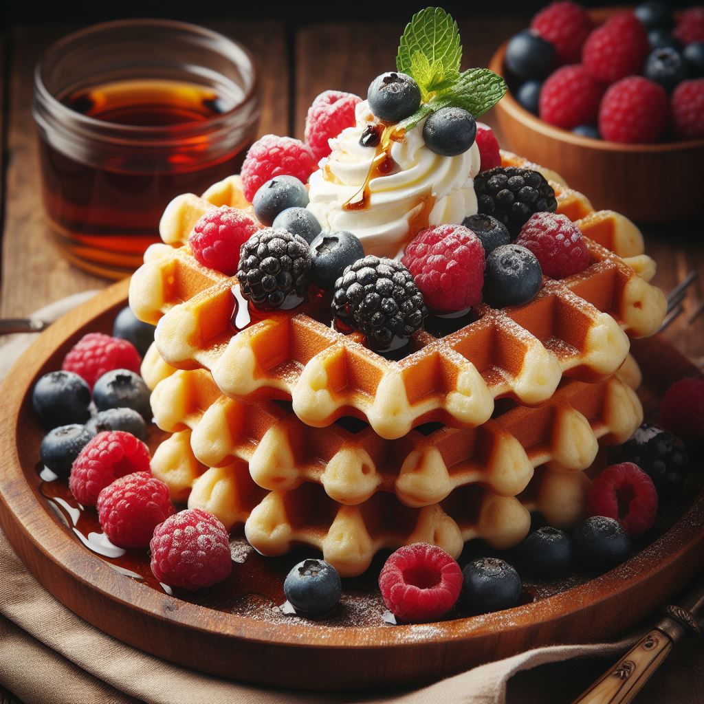 A stack of waffles topped with whipped cream, berries, and a drizzle of syrup.