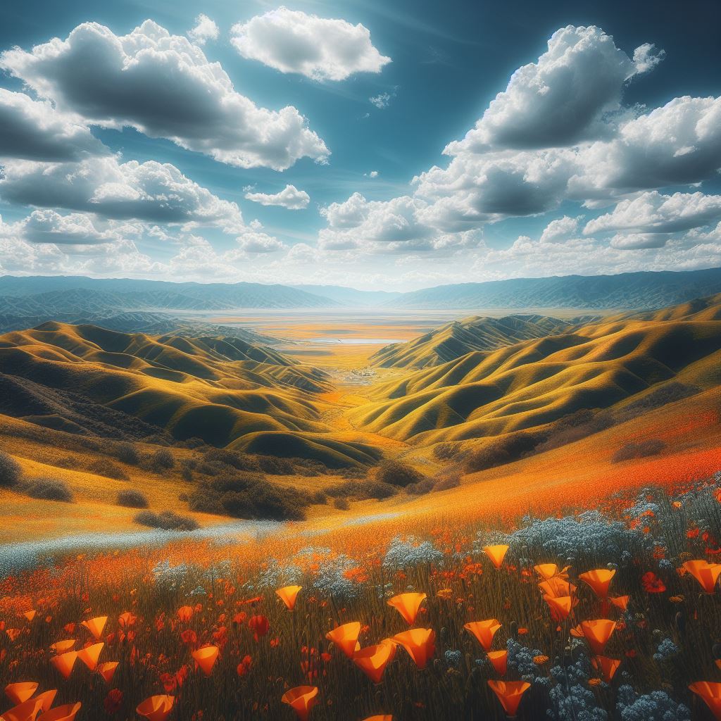California valley filled with colorful wildflowers against rolling hills under a bright blue sky with fluffy white clouds