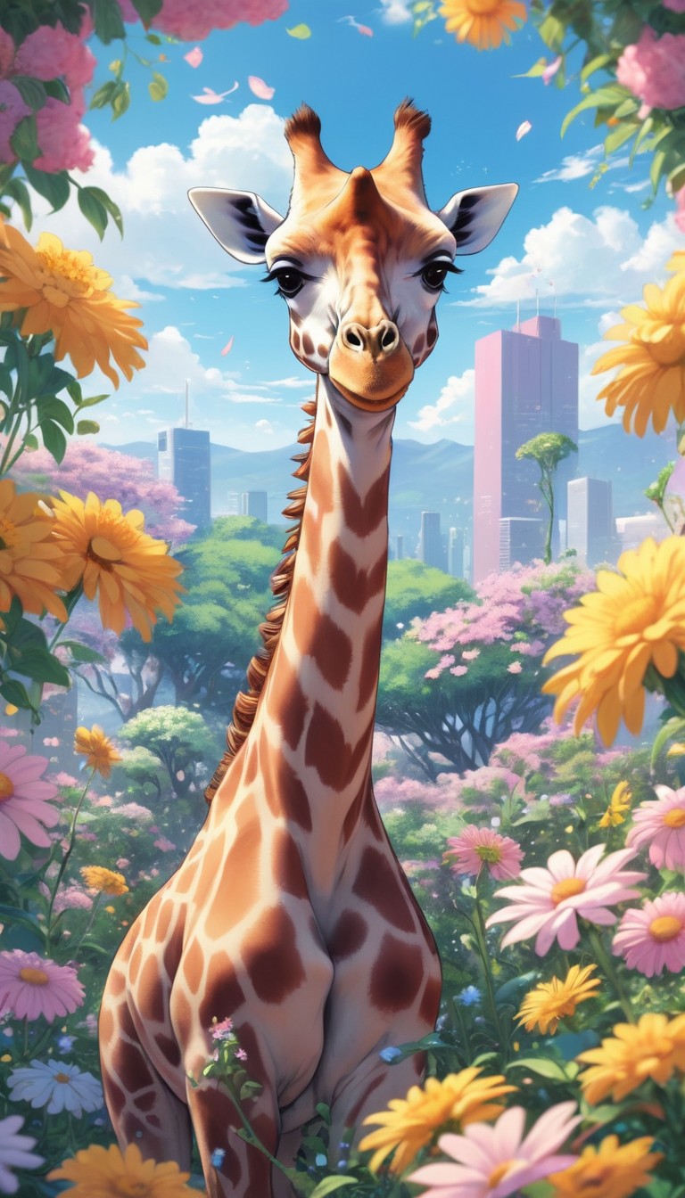 animal, brown, buildings, city, cityscape, colorful, field, flowers, giraffe, long, nature, neck, petals, sky, spotted, sunny, tall, urban, white, wildlife