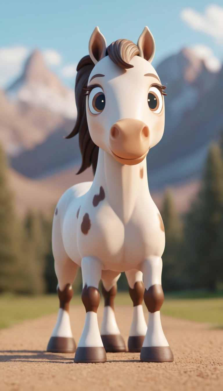 A cartoon horse with brown spots stands on a dirt road, smiling and looking at the camera, with mountains in the background.