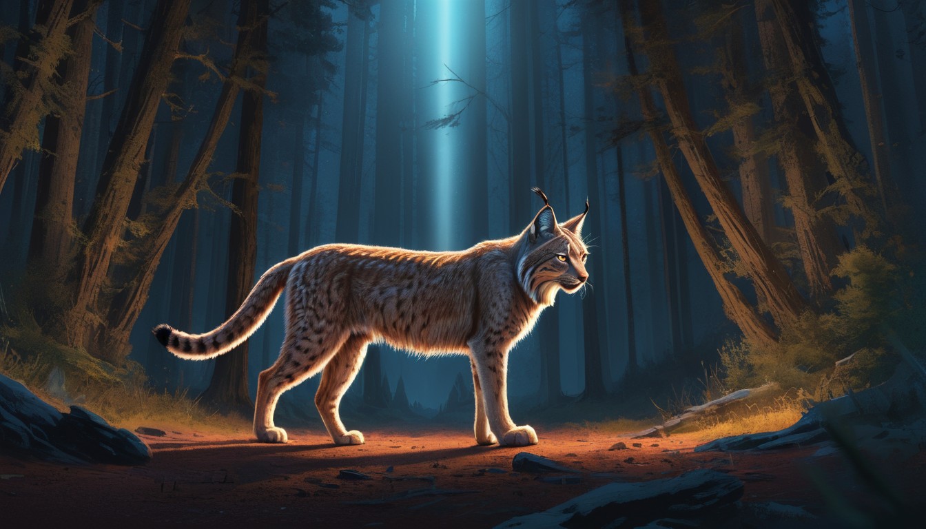 animal, beam, cat, creature, dark, forest, light, lynx, majestic, mammal, mysterious, nature, night, nocturnal, predator, shadows, trees, wild, wildlife, woodland