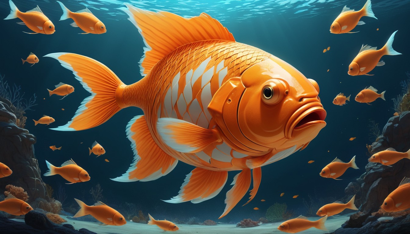 A large orange fish swims through a school of smaller fish, with coral reefs and other sea life in the background.