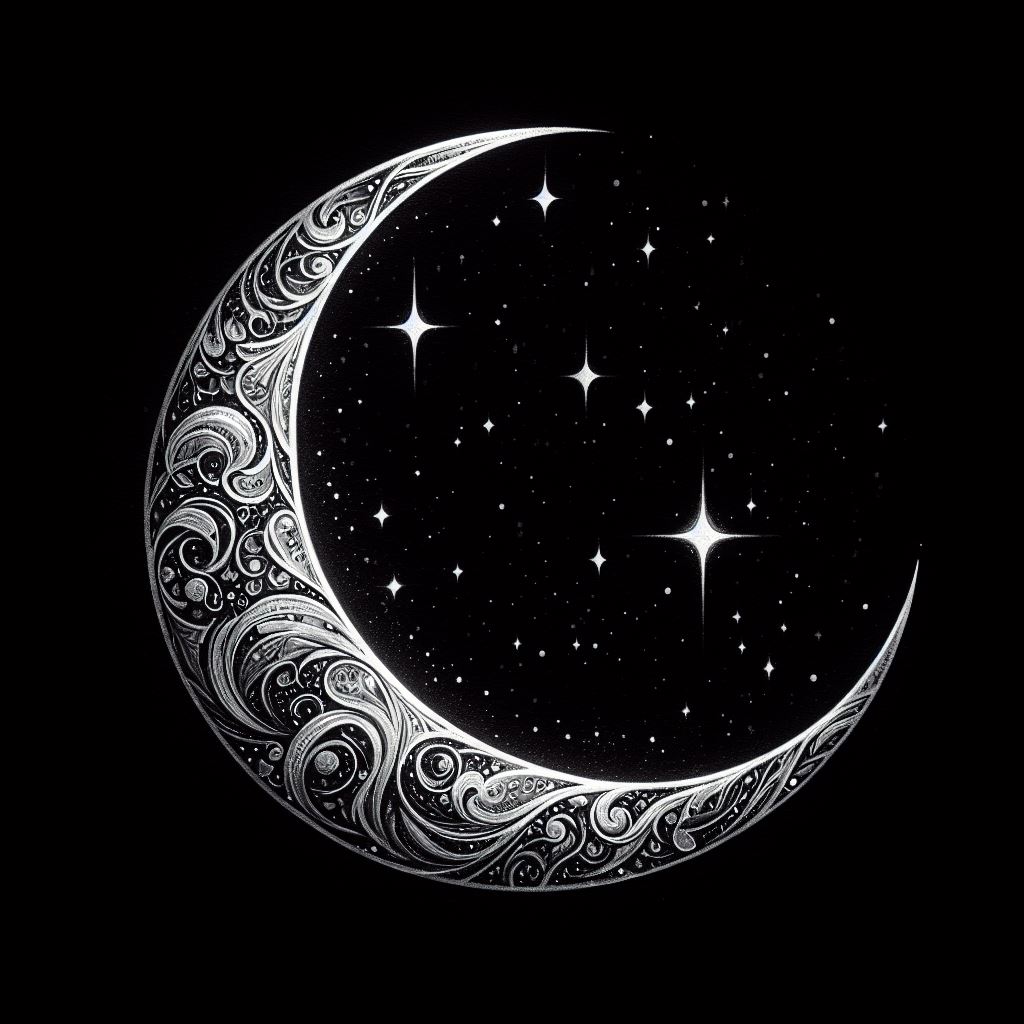 A crescent moon with intricate details is set against a dark sky, with stars twinkling around it.