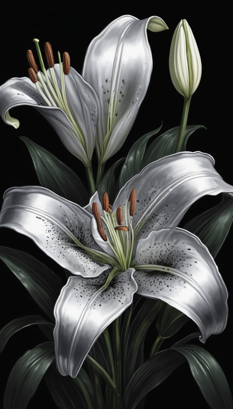 art, artwork, background, black, bloom, blossom, botanical, bud, design, digital, floral, flower, green, illustration, leaf, lilies, nature, petal, stem, white