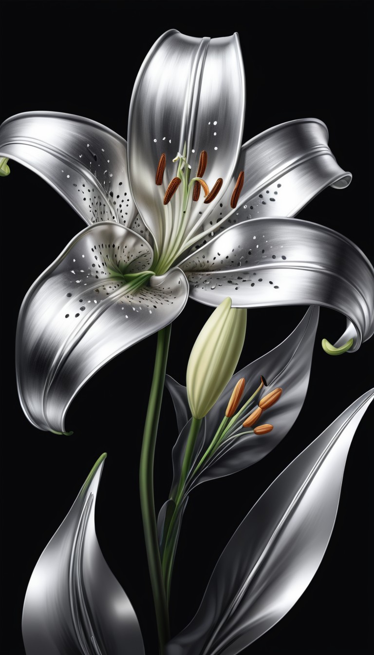 art, background, black, bloom, blossom, botanical, design, digital, floral, flower, graphic, illustration, leaves, lily, metallic, nature, plant, shiny, silver, stem