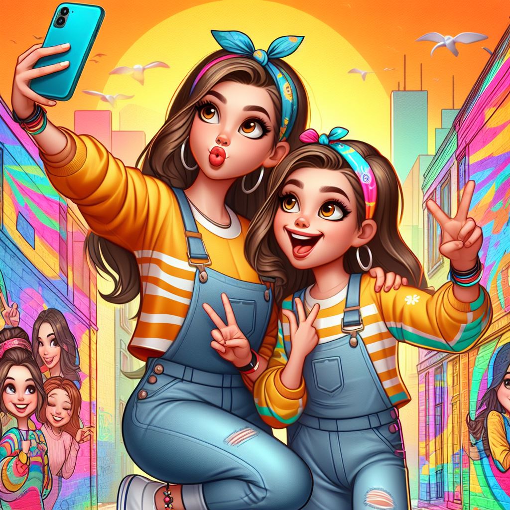 Two girls in yellow and blue overalls take a selfie in the city.