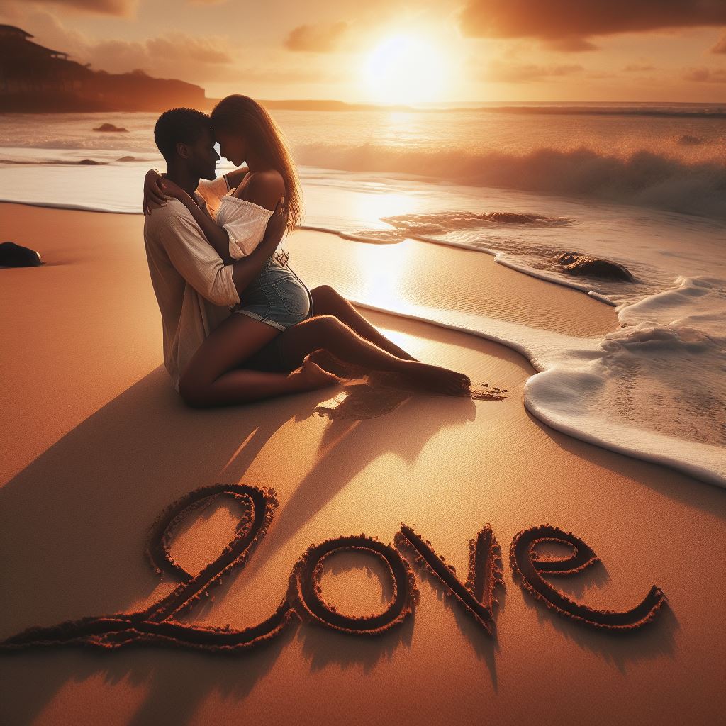 A couple embraces on a sandy beach as the sun sets, casting a golden glow over the scene. The word love is written in the sand nearby.
