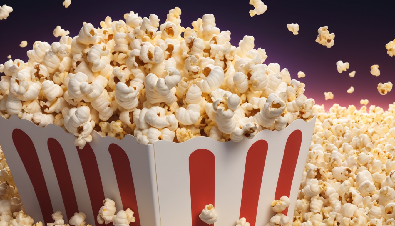 A red and white striped popcorn bucket overflows with freshly popped popcorn.