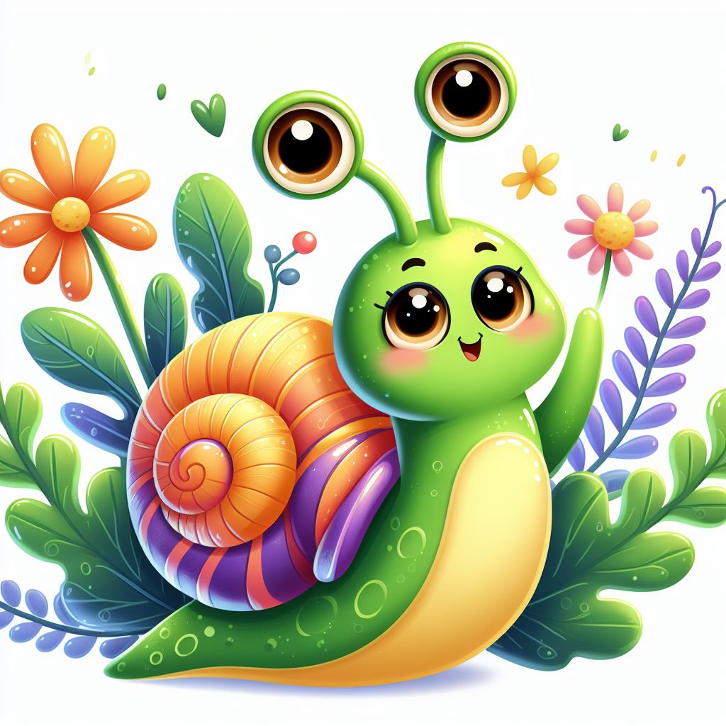 A cartoon snail with big eyes smiles happily as it holds a flower in its right hand.