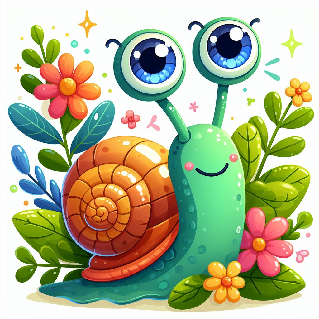 A cheerful cartoon snail with large blue eyes and a wide smile sits among green leaves and colorful flowers.