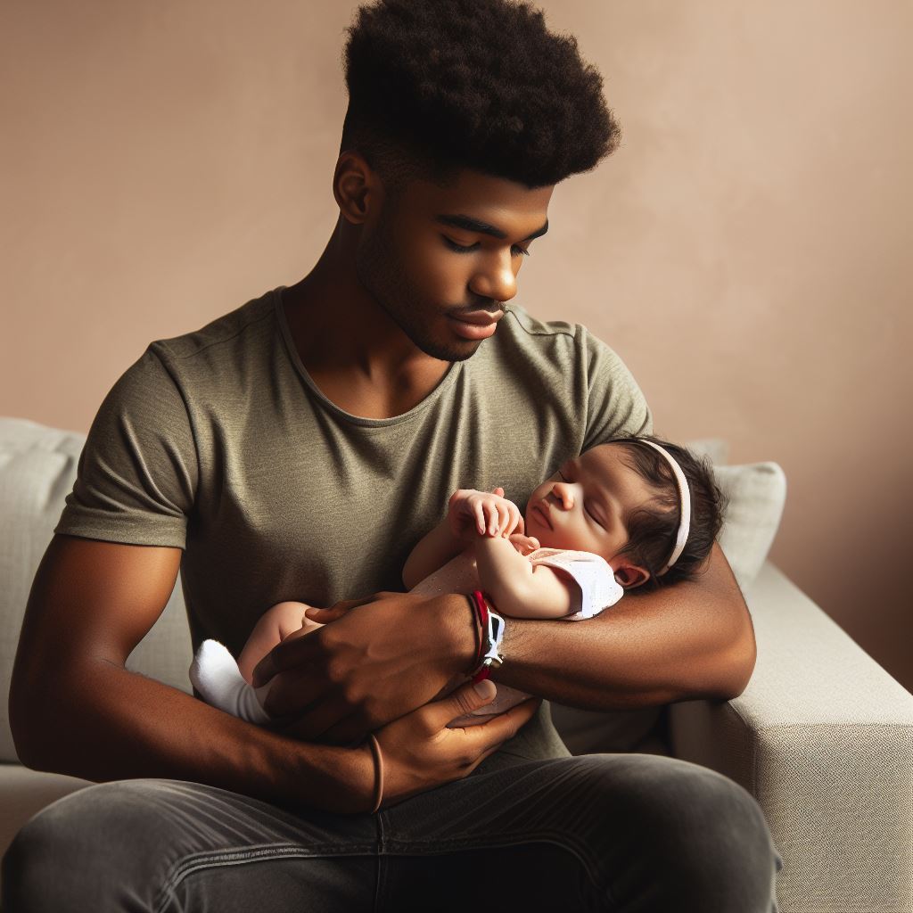 A father sits on a couch and holds his newborn baby in his arms. He looks down at the baby with love and tenderness.