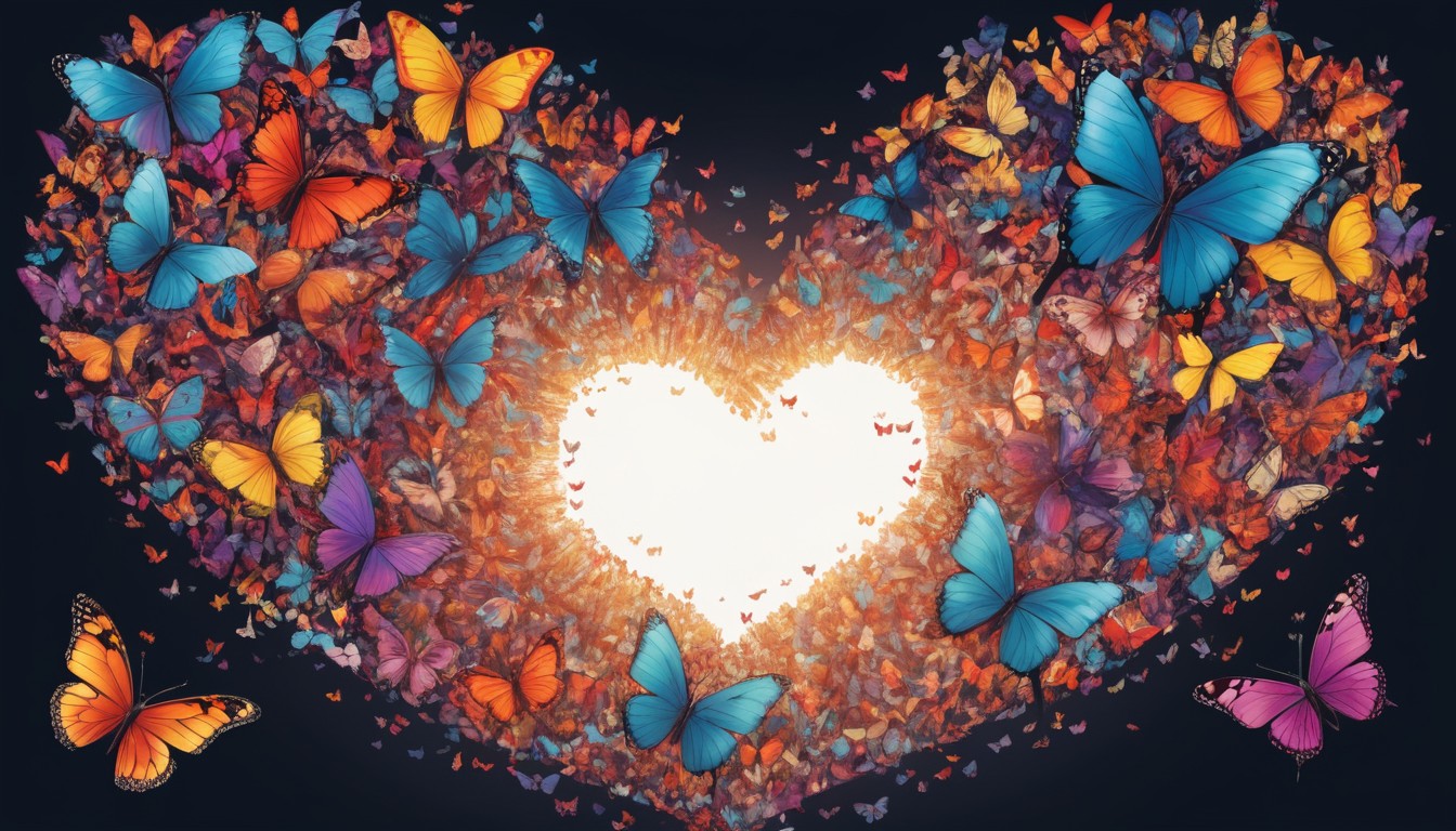 Colorful butterflies create a heart shape with a glowing white center, showcasing diversity in colors and patterns. 🦋💖