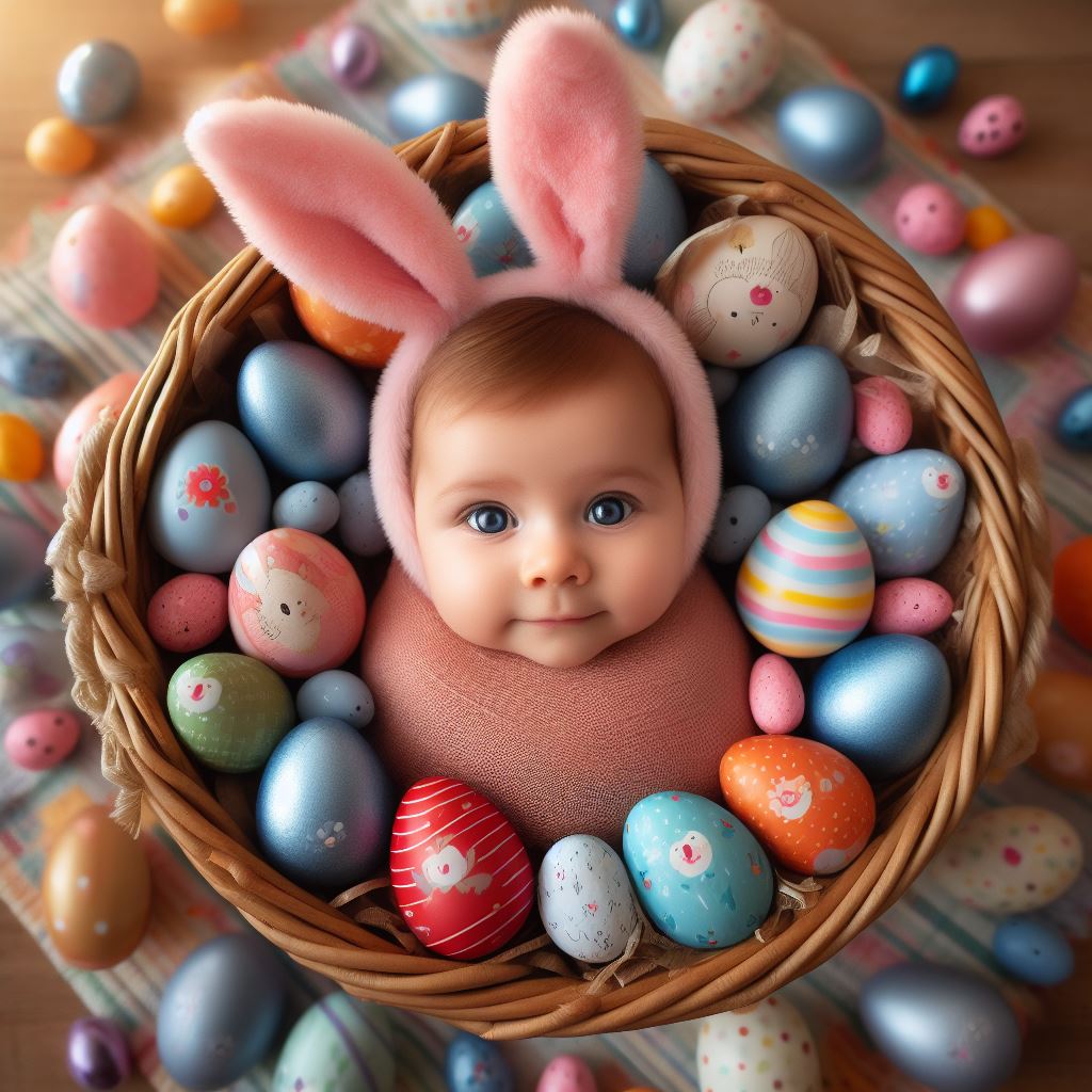 adorable, baby, basket, bunny, celebration, child, colorful, cute, ears, easter, eggs, festive, happiness, holiday, infant, innocence, joy, smile, spring, tradition