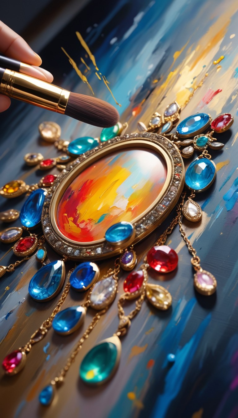 A hand holding a paintbrush paints a gold necklace with colorful gemstones.