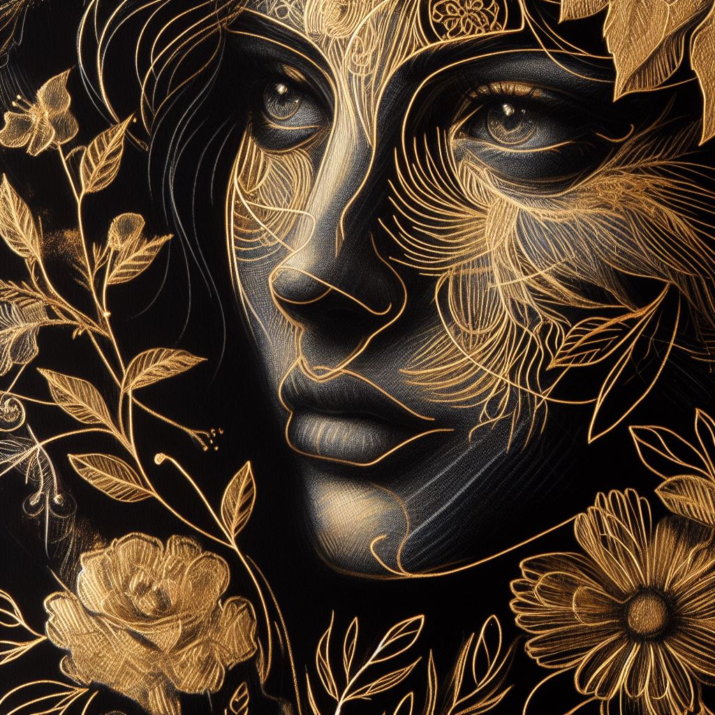 art, artwork, background, beauty, black, design, elegant, face, feminine, floral, gold, graphic, illustration, line, nature, pattern, portrait, sketch, style, woman