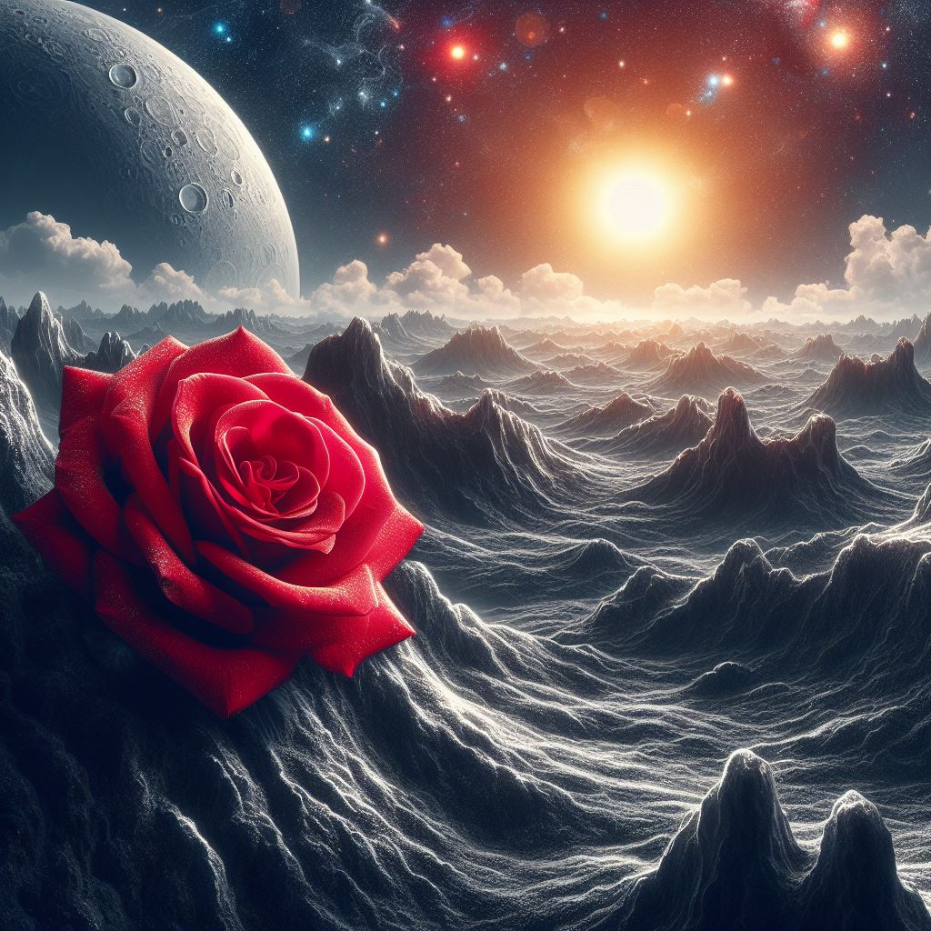 A red rose sits on a rocky, mountainous landscape with a distant sun and moon in the sky.