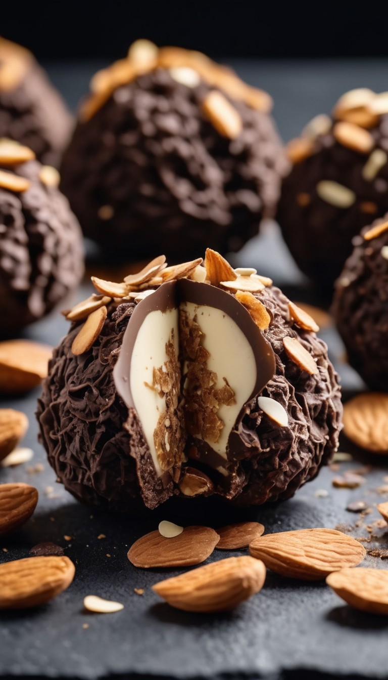 A close-up of a chocolate truffle with almond filling and chopped almonds.