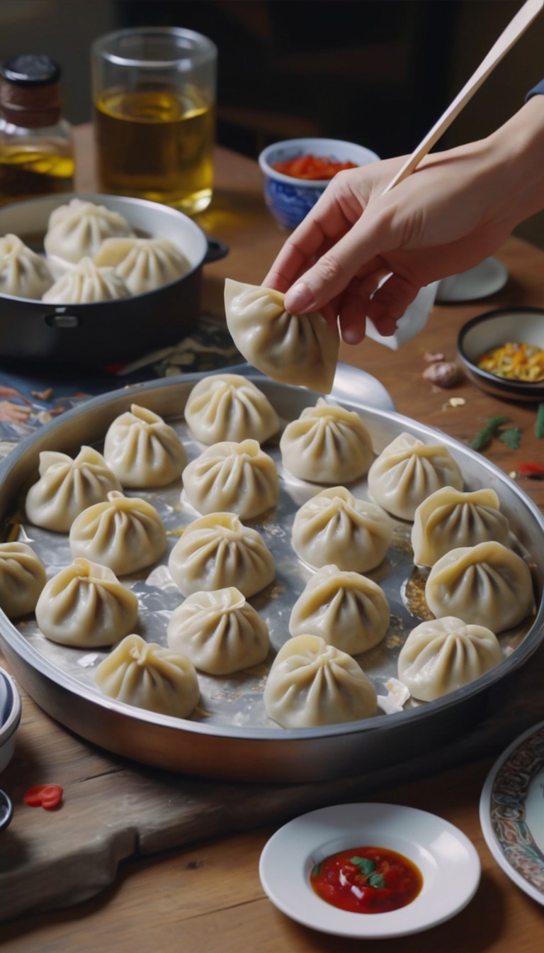 appetizer, asian, chinese, chopsticks, cuisine, delicious, dinner, dumplings, food, hand, japanese, korean, lunch, plate, red, sauce, steamed, table, tray, wooden