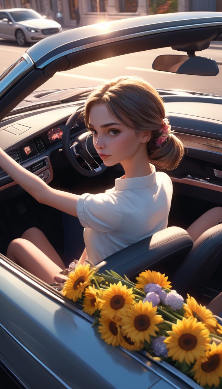 afternoon, bouquet, brown, car, city, convertible, driving, flowers, hair, passenger, road, seat, seatbelt, steering, summer, sunflowers, sunlight, wheel, white, woman