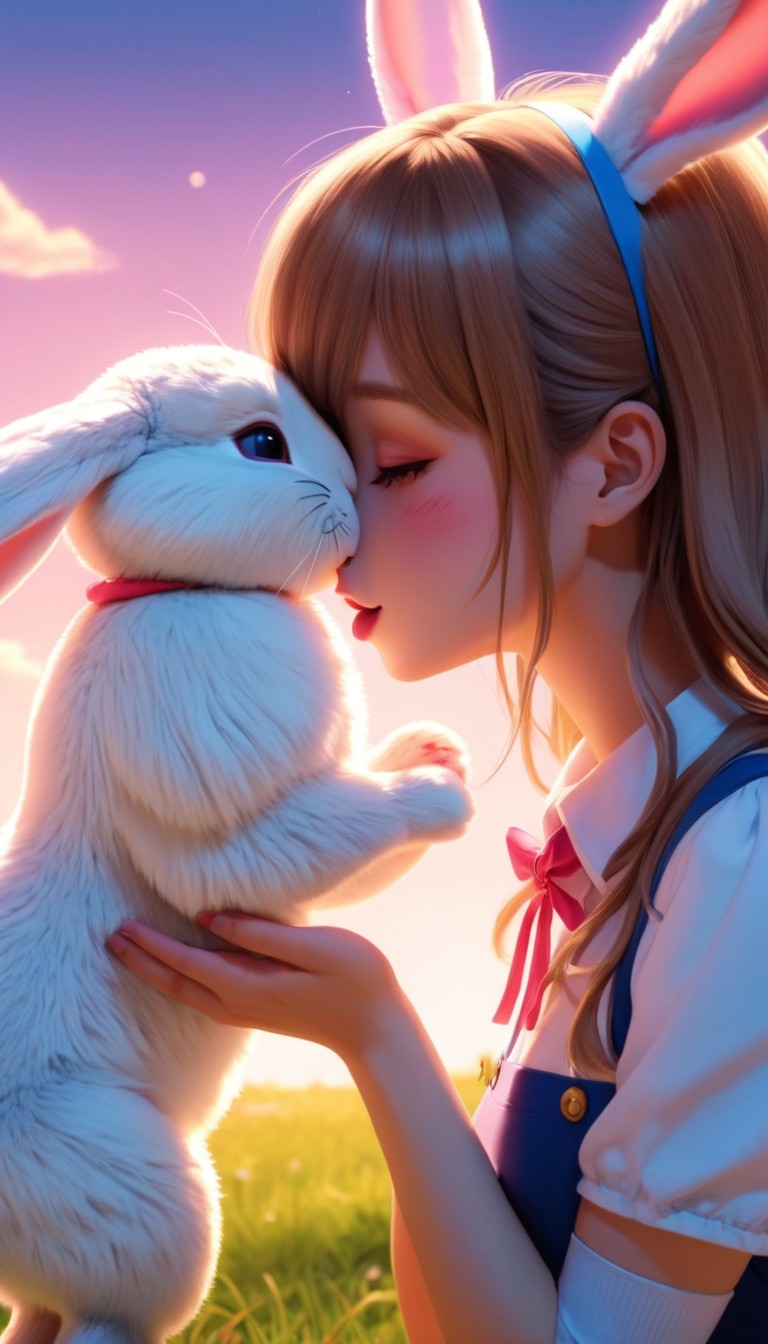 adorable, animal, anime, art, bunny, cartoon, character, cute, digital, field, friendship, girl, happy, illustration, kiss, love, nature, pet, rabbit, sunset