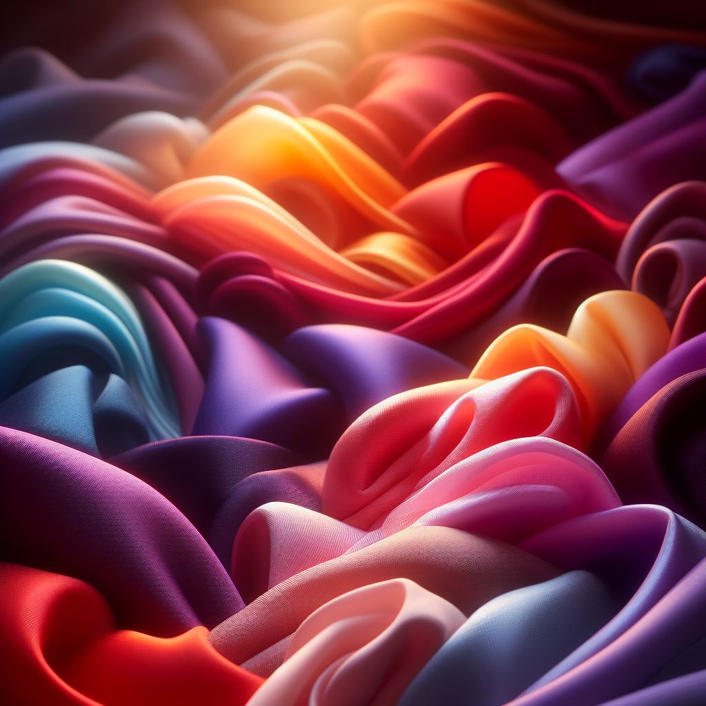 A vibrant collection of silk fabrics draped in various shades, illuminated by a soft, warm light.