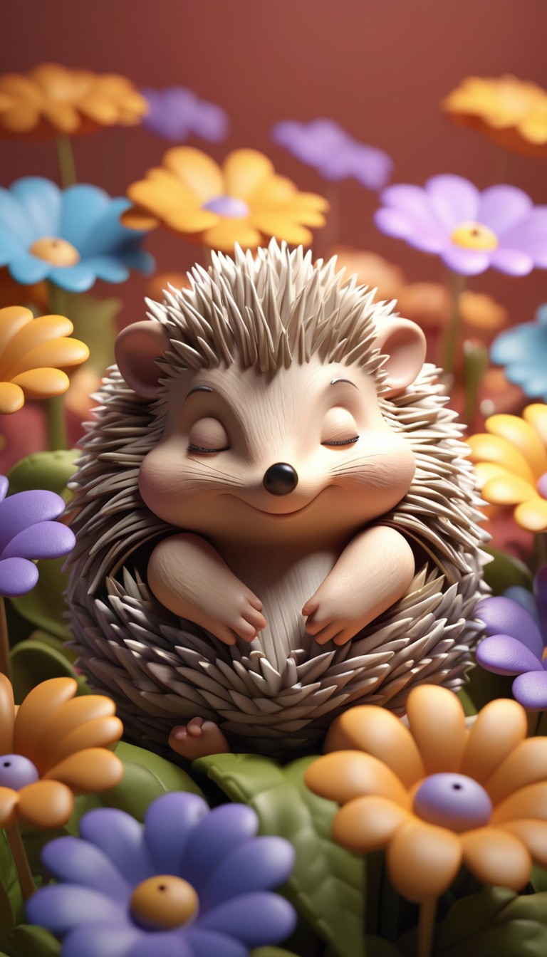 A cute, smiling hedgehog with closed eyes rests in a field of colorful flowers.