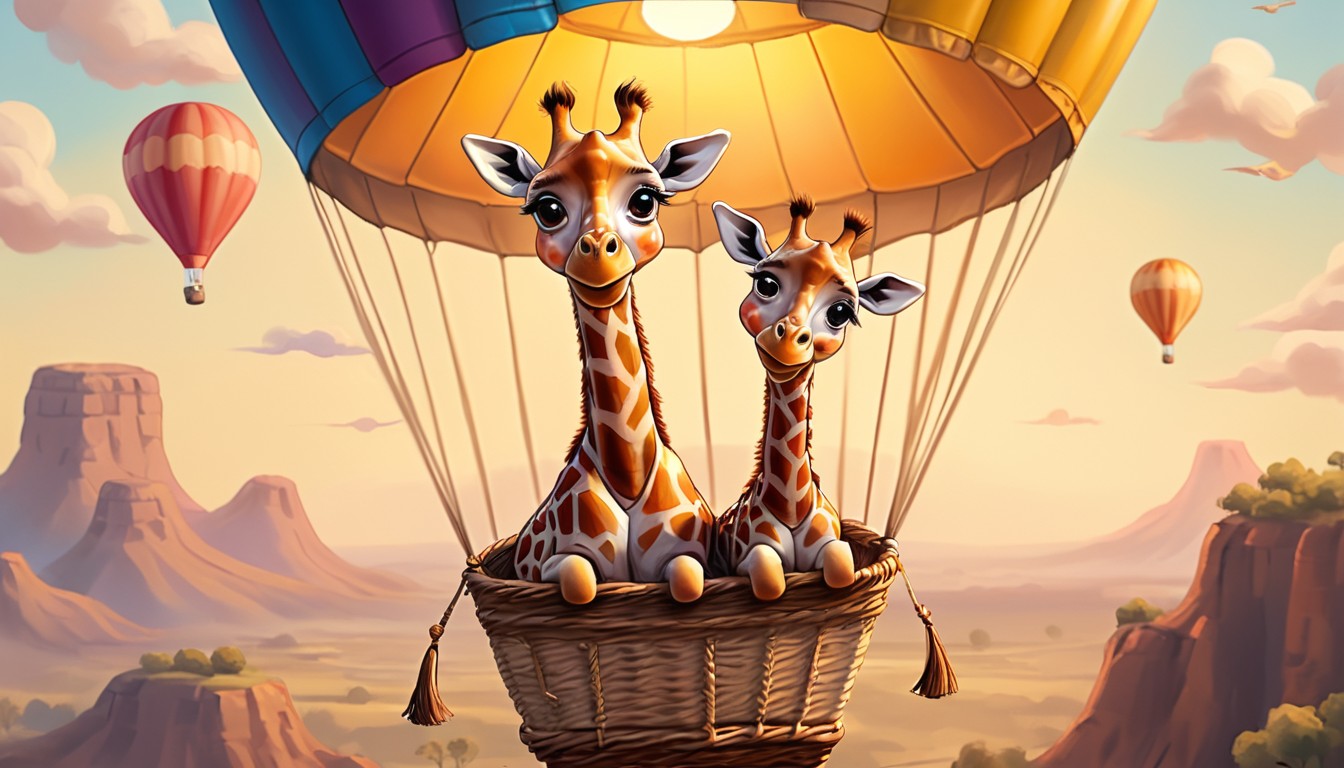 Two giraffes enjoy a hot air balloon ride over a desert landscape, surrounded by other balloons in the distance. Happy and content
