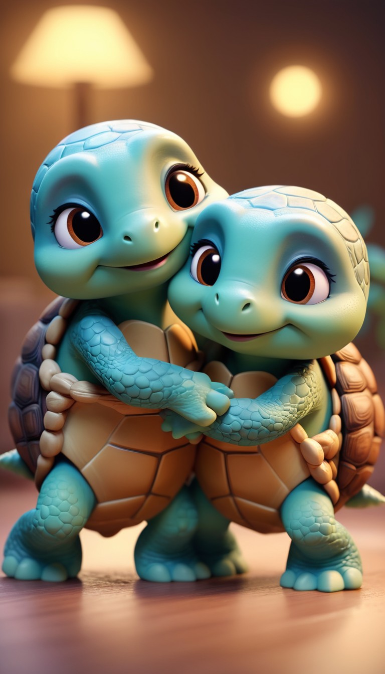 Two cartoon turtle toys hug each other on a wooden surface.