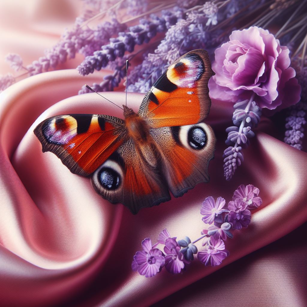 A colorful butterfly rests on a bed of lavender and pink silk.