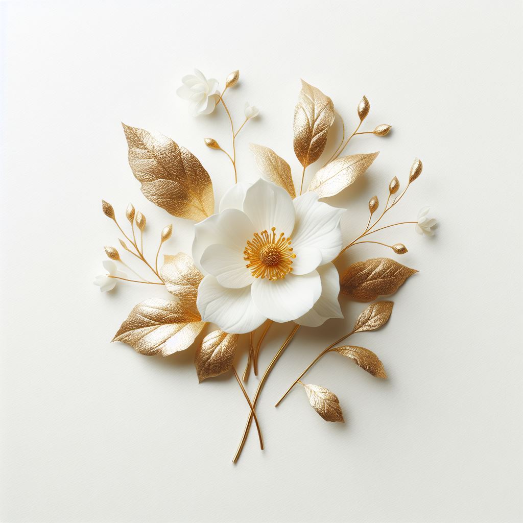 A white flower with a golden center surrounded by gold leaves.