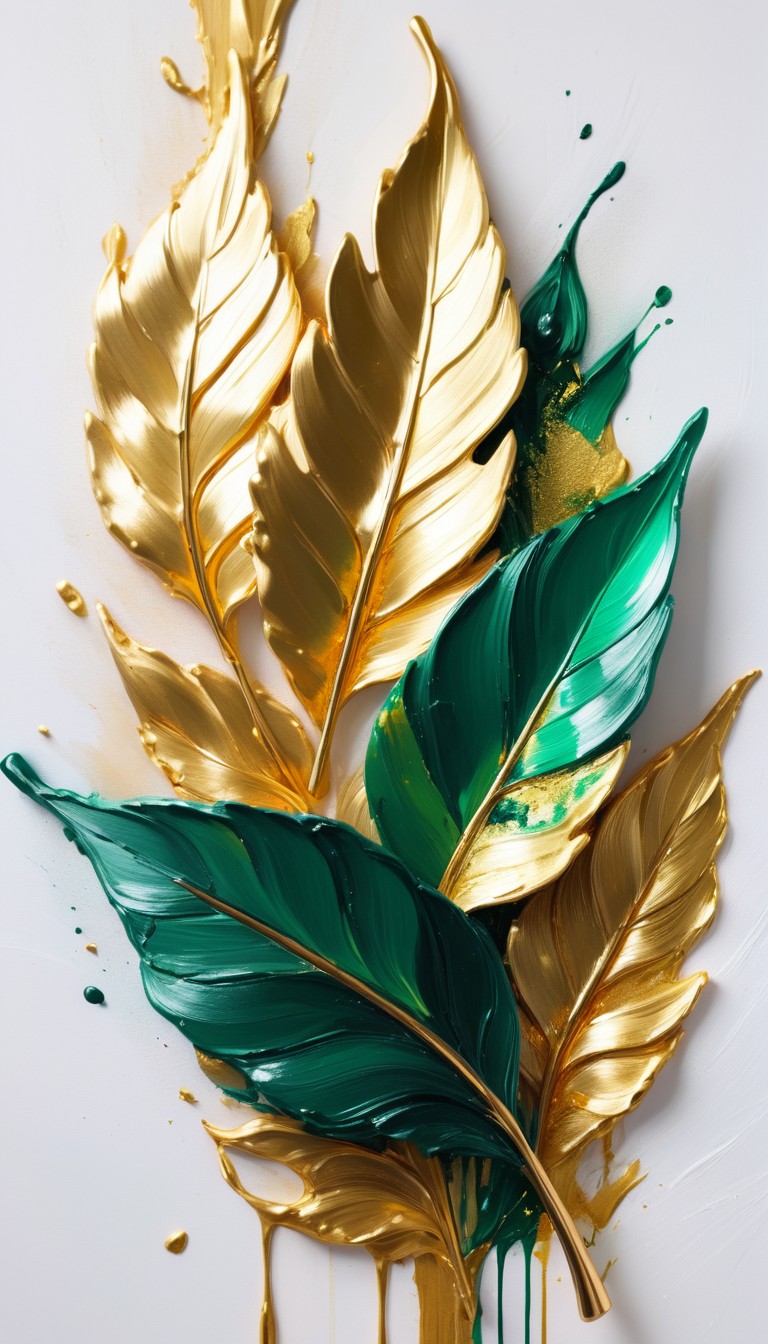 abstract, art, artwork, brushstrokes, canvas, contemporary, decor, design, dripping, foliage, gold, green, home, leaves, modern, nature, painting, style, texture, visual