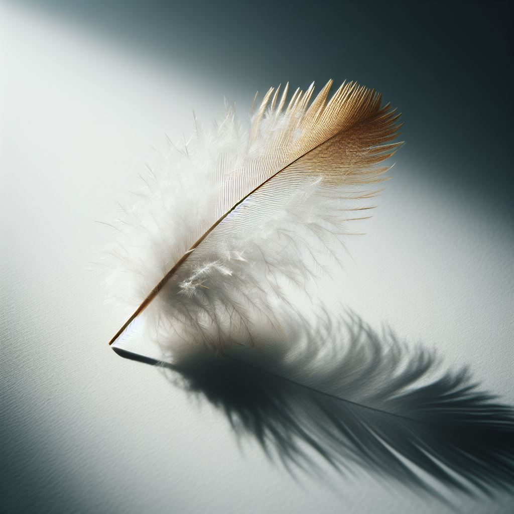 A single white feather casts a long shadow on a light grey surface, illuminated by a beam of light.