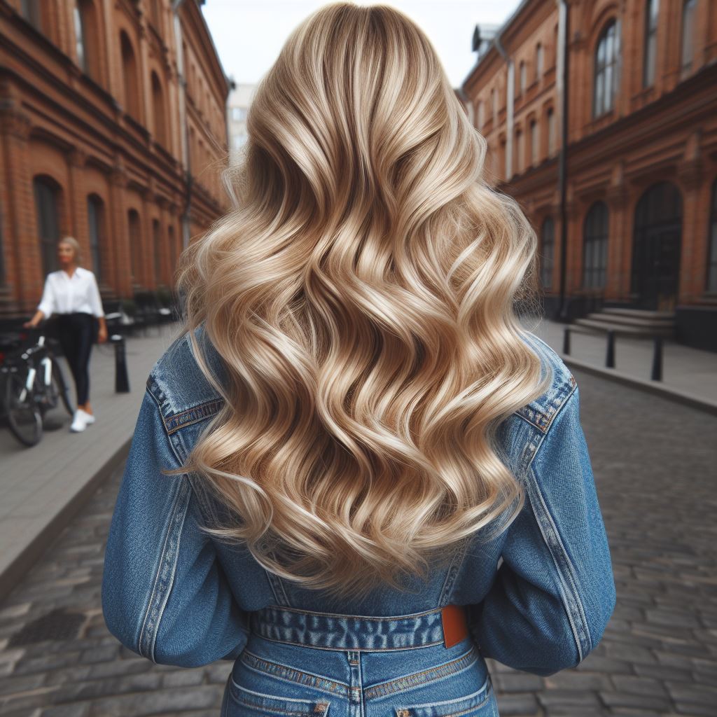 beauty, blonde, casual, city, daytime, denim, fashion, hair, haircare, hairstyle, jacket, long, model, outdoor, street, style, urban, walking, wavy, woman