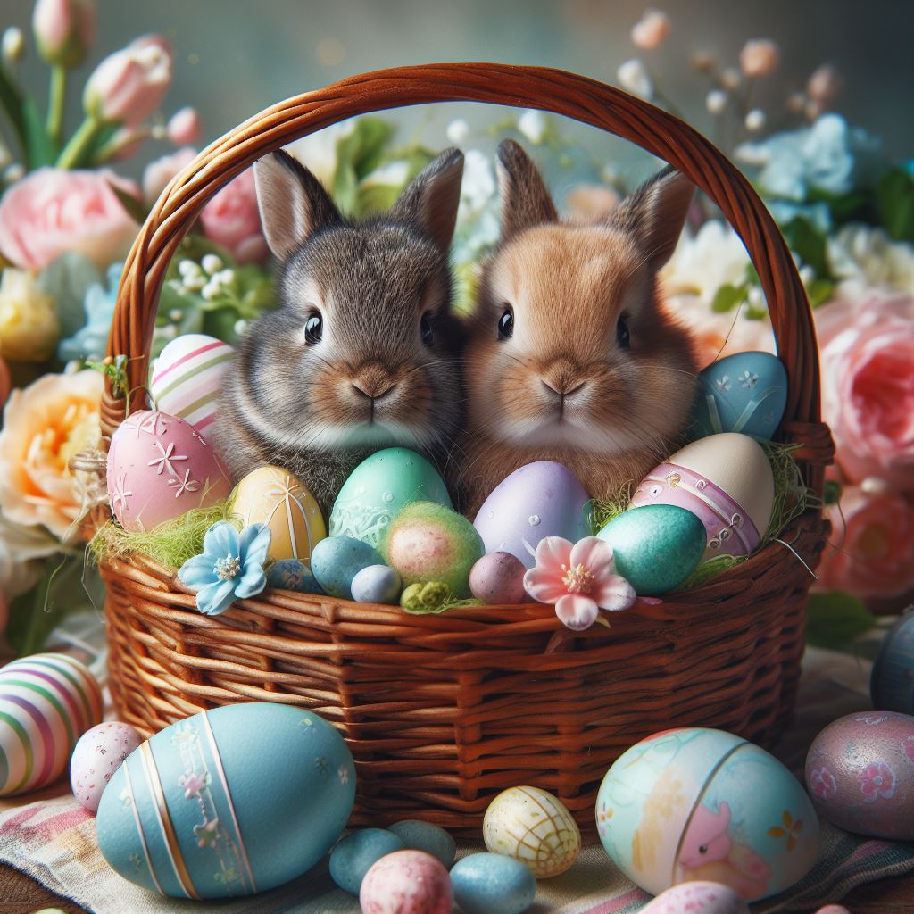 Two bunnies sit in a basket with many colorful Easter eggs.