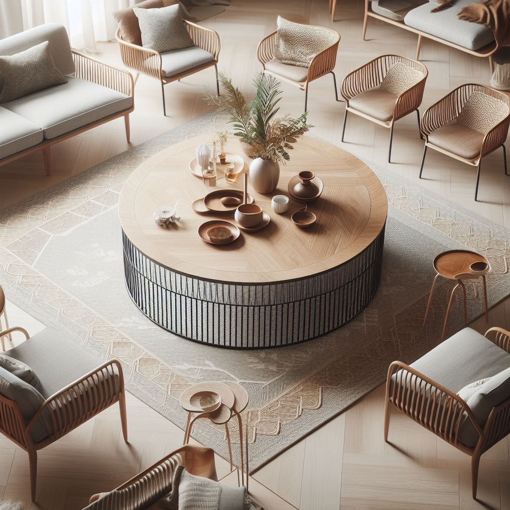chairs, coffee, contemporary, decor, design, frame, furniture, home, interior, living, metal, minimalist, modern, room, round, rug, style, stylish, table, wooden