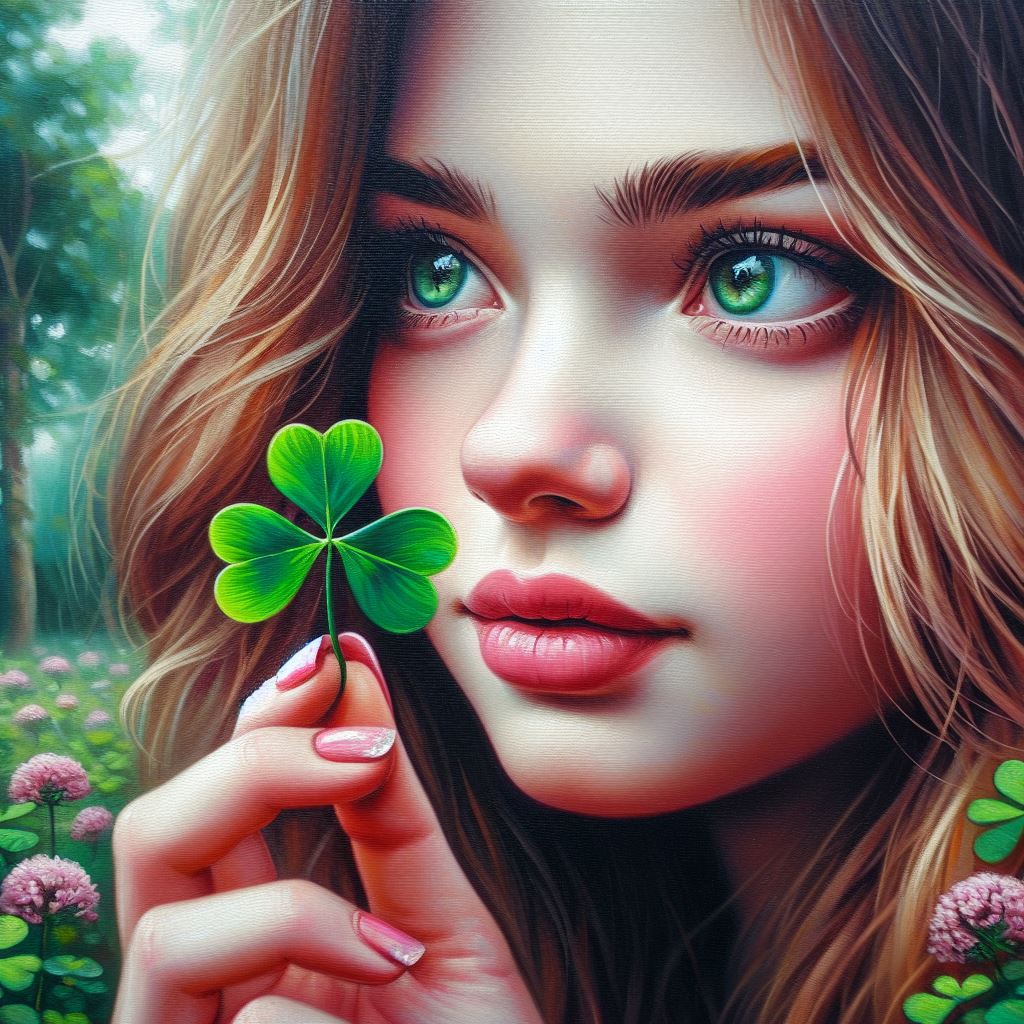 A woman with long, flowing blonde hair holds a four-leaf clover in her hand.
