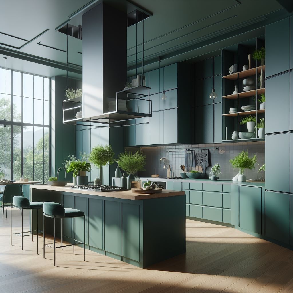 A modern kitchen with a large island, dark green cabinets, and natural light streaming in.