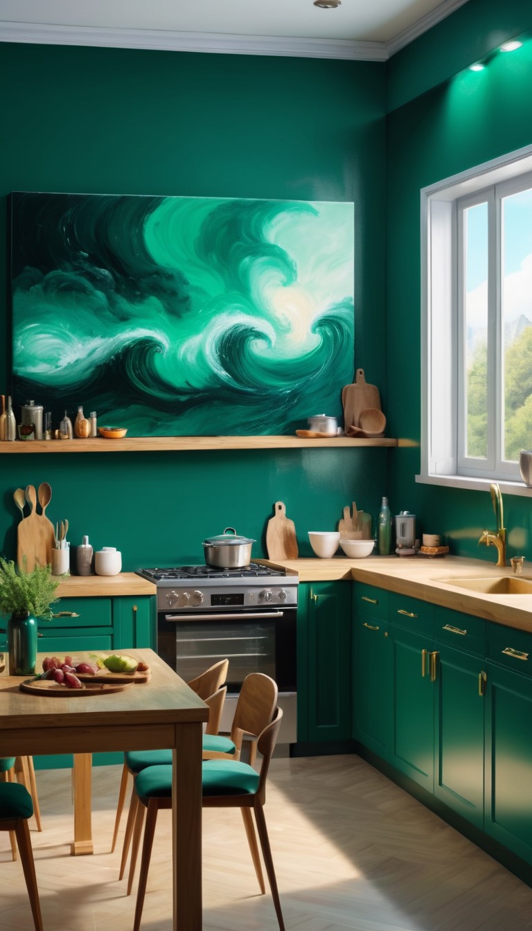Green kitchen with wave painting