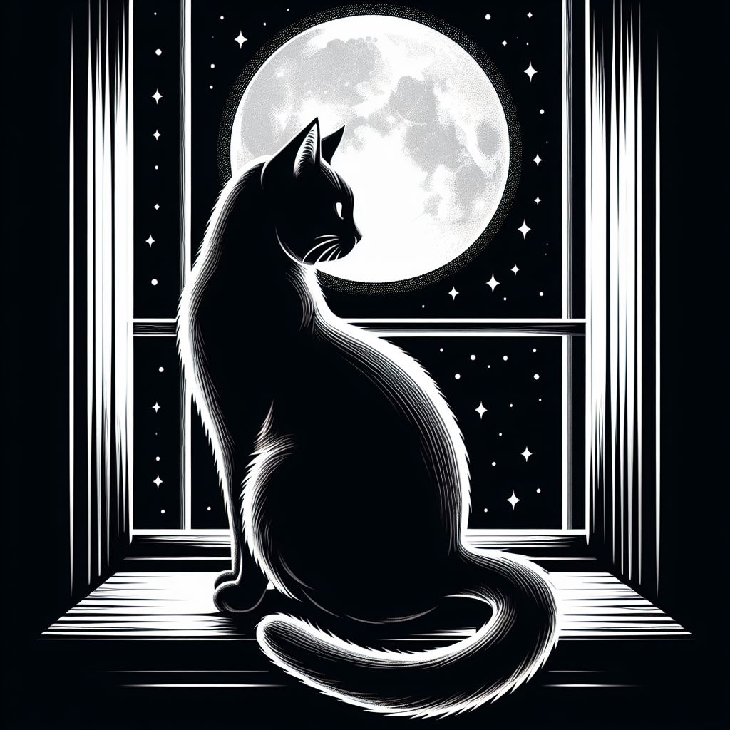 black, cat, dark, dream, feline, full, gazing, looking, moon, moonlight, night, nocturnal, observe, silhouette, sitting, sky, stars, white, window, windowsill