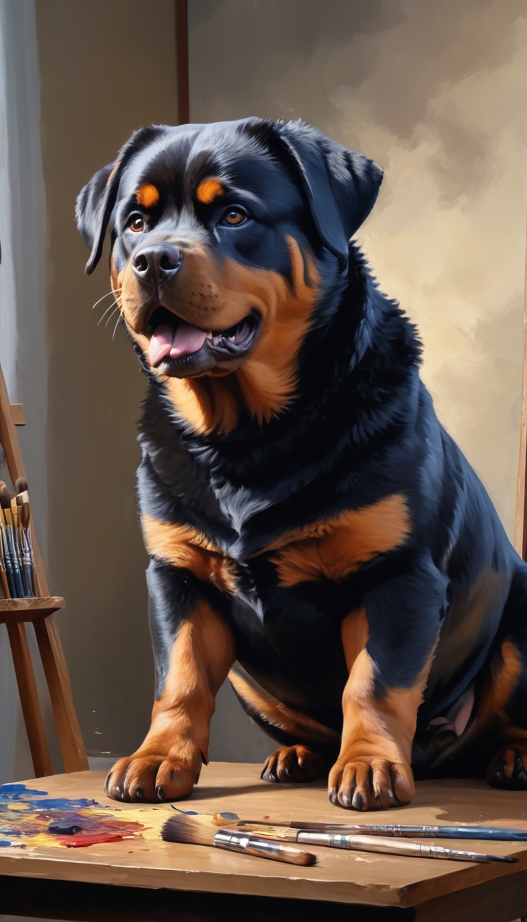 animal, art, black, brown, brushes, canine, dog, eyes, mouth, paint, painting, paws, pet, portrait, posing, rottweiler, sitting, studio, table, tan