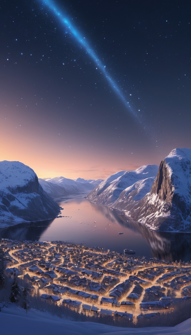 aurora, borealis, cold, fjord, landscape, light, mountains, nature, night, reflection, scenic, shooting, sky, snow, star, stars, town, travel, water, winter