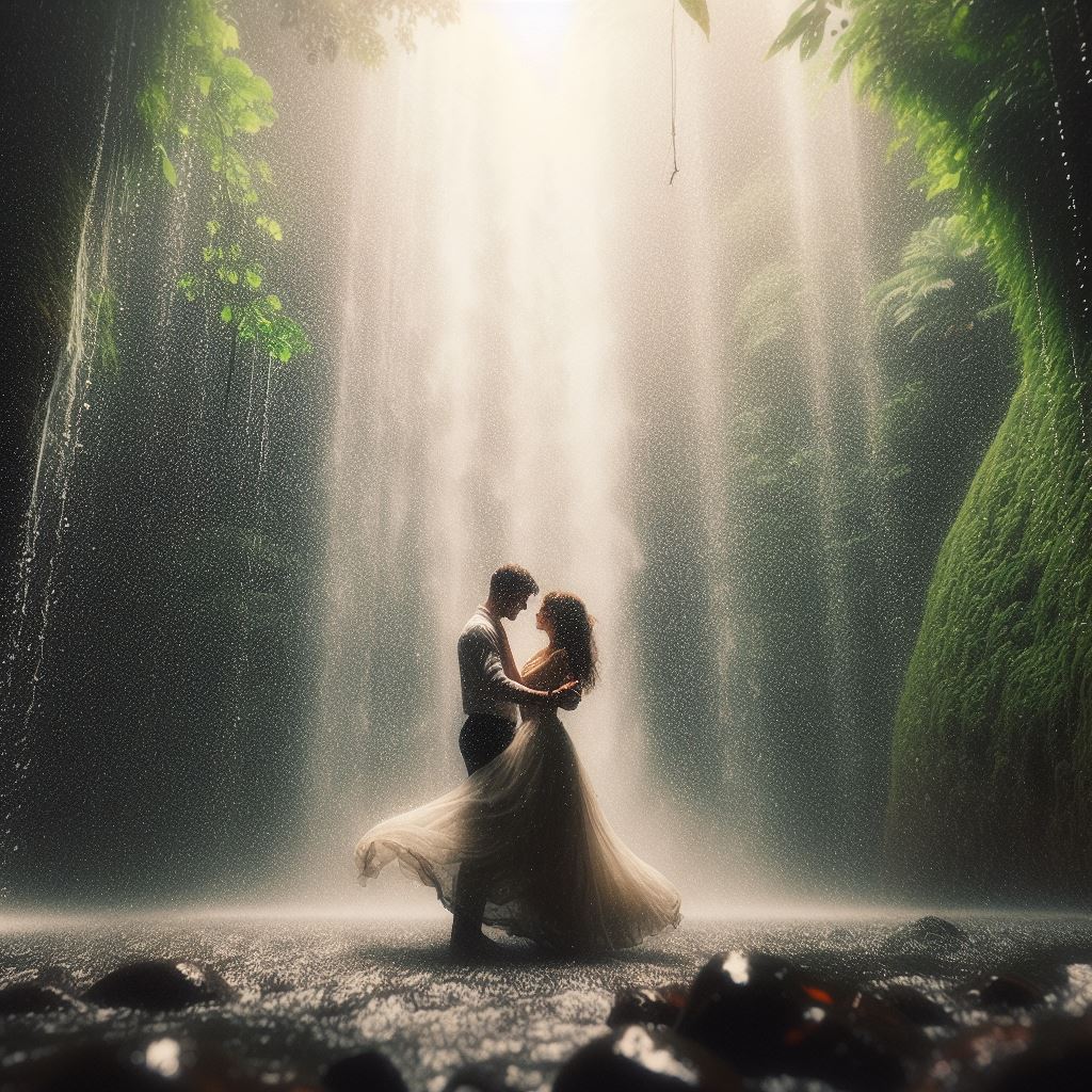 A couple stands close together, embraced in the mist of a waterfall, surrounded by lush greenery.